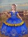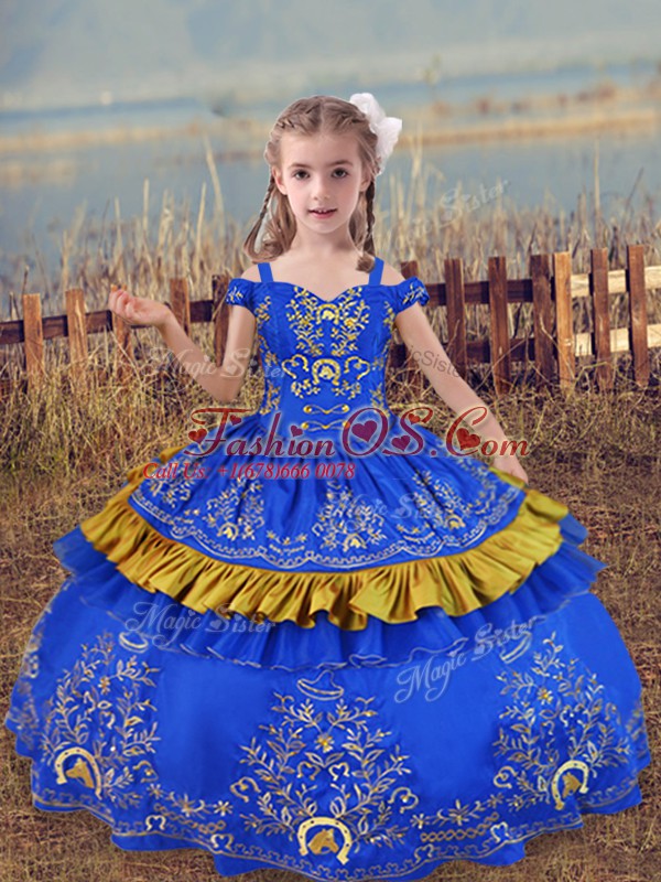 Home >  Special Occasion Dresses >  2019 Little Girl Pageant Dresses > Blue Little Girls Pageant Dress Wedding Party with Beading and Embroidery Off The Shoulder Sleeveless Lace Up