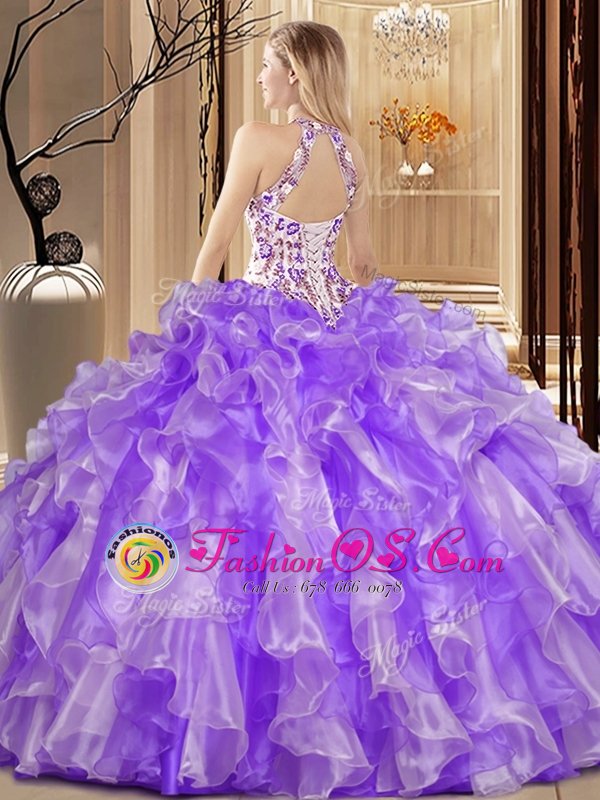 Home >  Quinceanera Dresses >  Cheap Quinceanera Dresses > Blue Organza Backless Scoop Sleeveless Floor Length Quinceanera Gowns Embroidery and Ruffles
