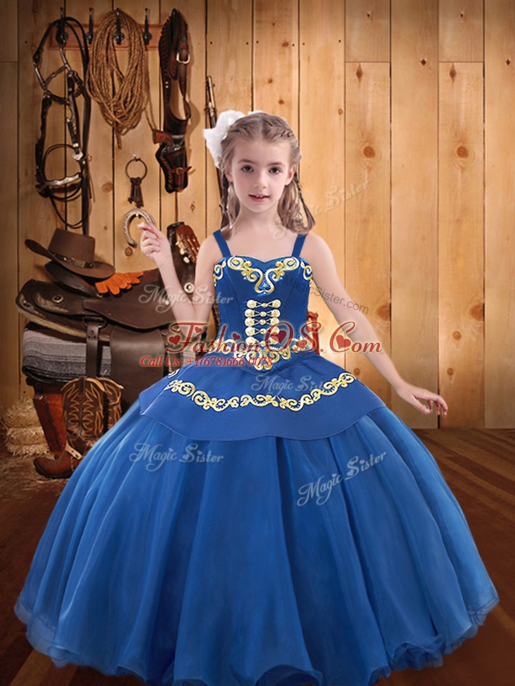 Home >  Special Occasion Dresses >  Beautiful Kids Pageant Dresses > Blue Organza Lace Up Pageant Dresses Sleeveless Floor Length Beading and Embroidery and Ruffles