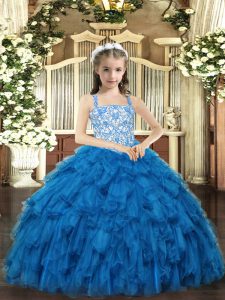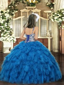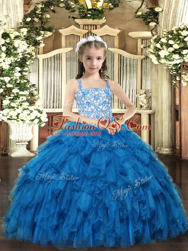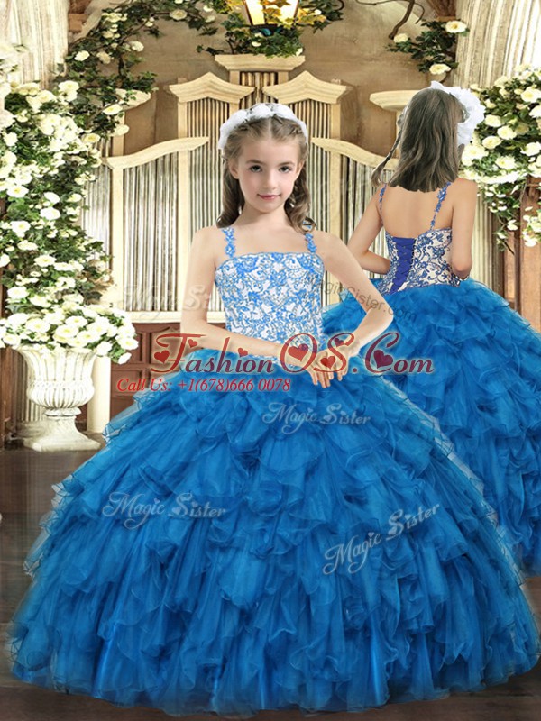 Home >  Special Occasion Dresses >  Lovely Little Girl Pageant Dresses > Blue Organza Lace Up Straps Sleeveless Floor Length Child Pageant Dress Beading and Ruffles