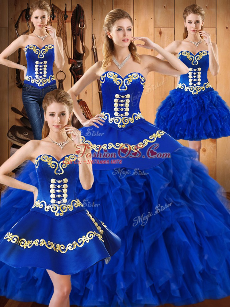 Home >  Quinceanera Dresses >  Detachable Quinceanera Skirts > Blue Satin and Organza Lace Up Sweetheart Sleeveless Floor Length 15 Quinceanera Dress Embroidery and Ruffles