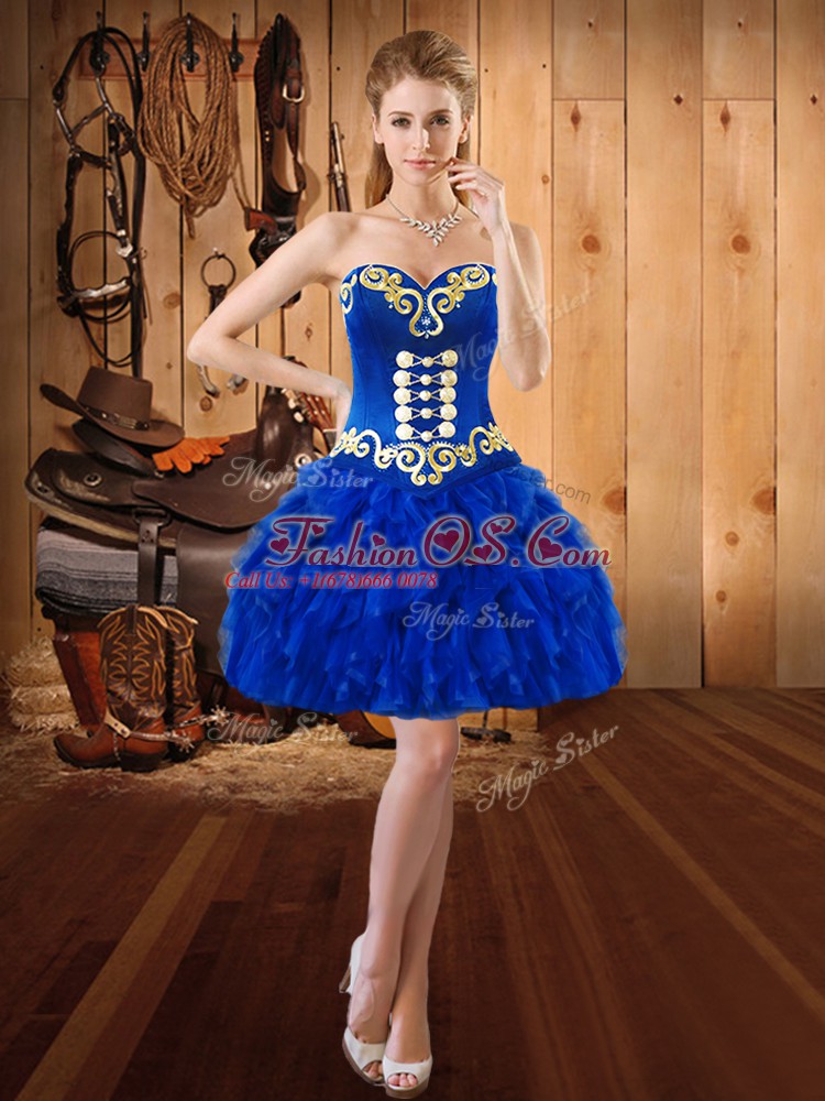 Blue Satin and Organza Lace Up Sweetheart Sleeveless Floor Length 15 Quinceanera Dress Embroidery and Ruffles