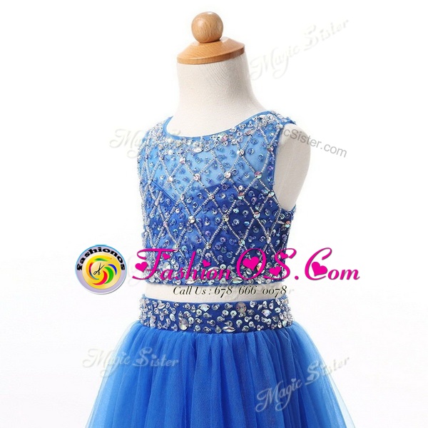 Blue Scoop Zipper Beading Flower Girl Dresses for Less Sleeveless