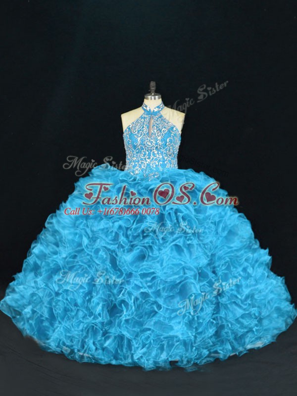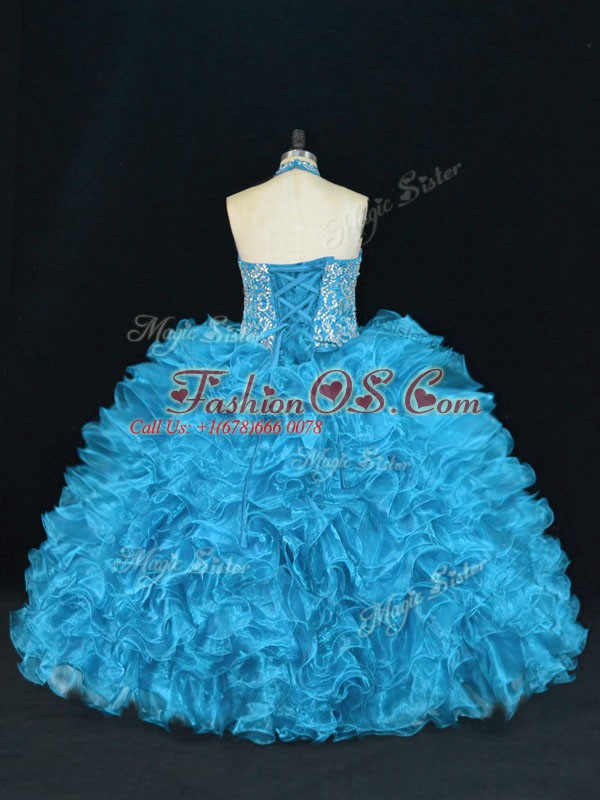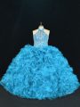 Blue Sleeveless Beading and Ruffles Floor Length 15th Birthday Dress