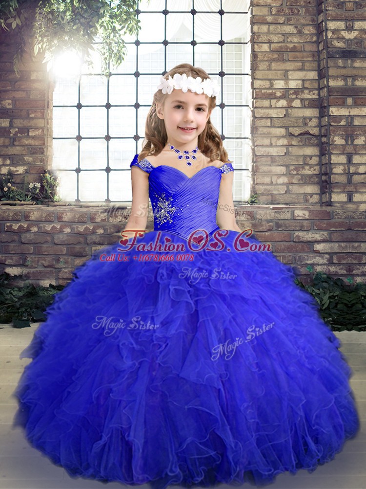 Home >  Special Occasion Dresses >  Lovely Little Girl Pageant Dresses > Blue Sleeveless Floor Length Beading and Ruffles Lace Up Little Girls Pageant Dress