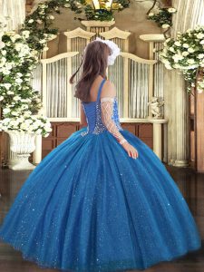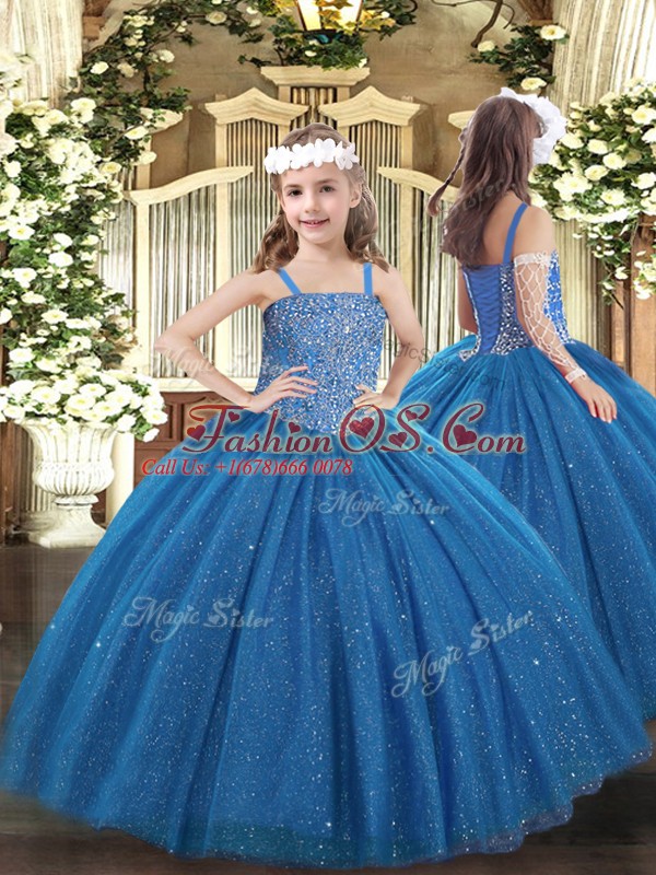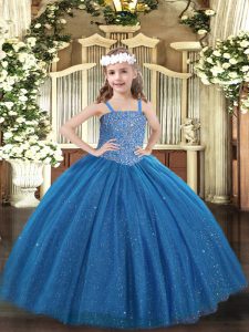 Blue Sleeveless Floor Length Beading Lace Up Little Girl Pageant Gowns
