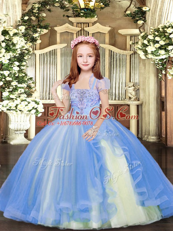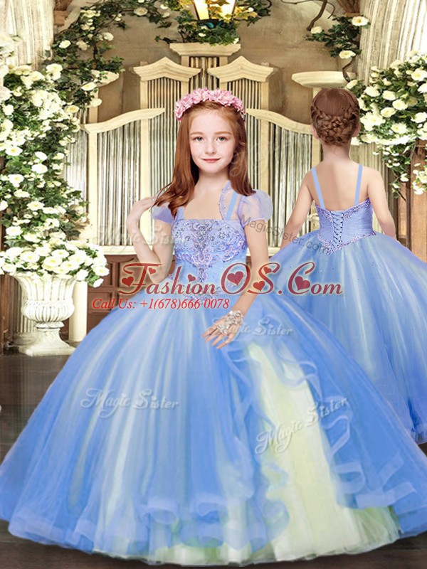 Home >  Special Occasion Dresses >  Pretty Little Girl Pageant Dresses > Blue Straps Lace Up Beading Little Girl Pageant Dress Sleeveless
