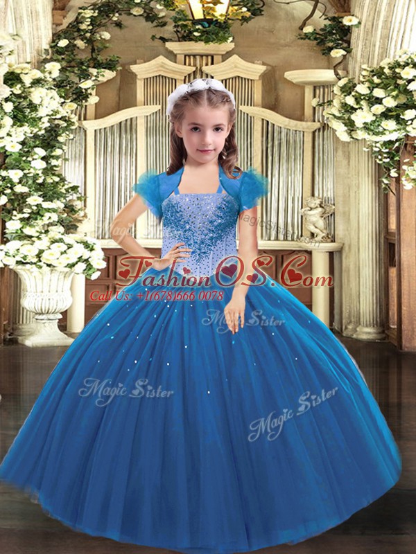 Blue Straps Neckline Beading Girls Pageant Dresses Sleeveless Lace Up
