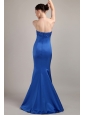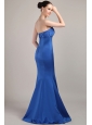 This blue mermaid dress is the perfect one to show your grace and charming.Fitted bodice design with some scattered beaded decoration and ruchings makes the gown so beautiful that you can gain more attention.The floor-length skirt in stunning fabric contures your slim figure.A zipper up back style closure in the back secures the dress in place.