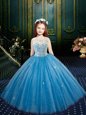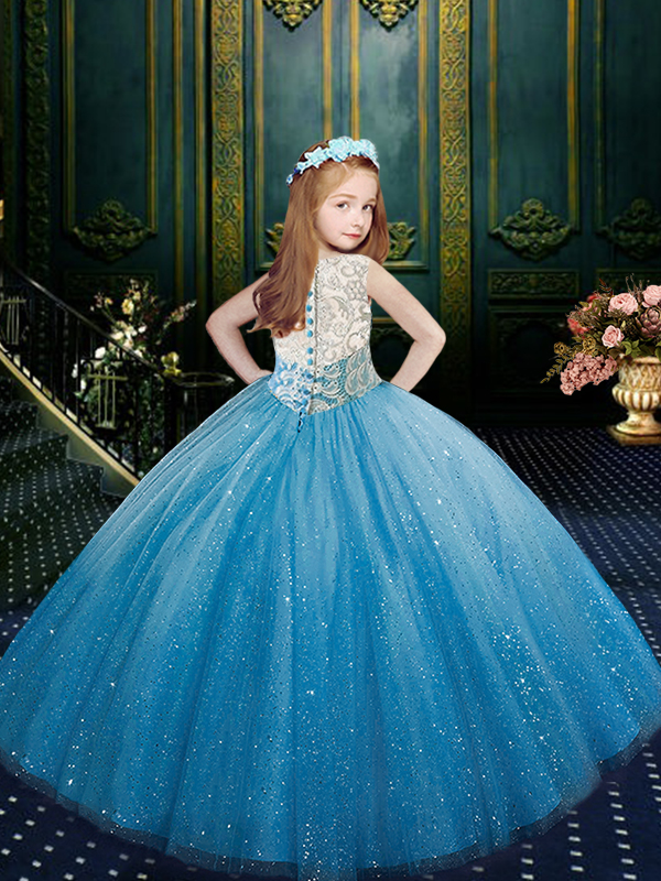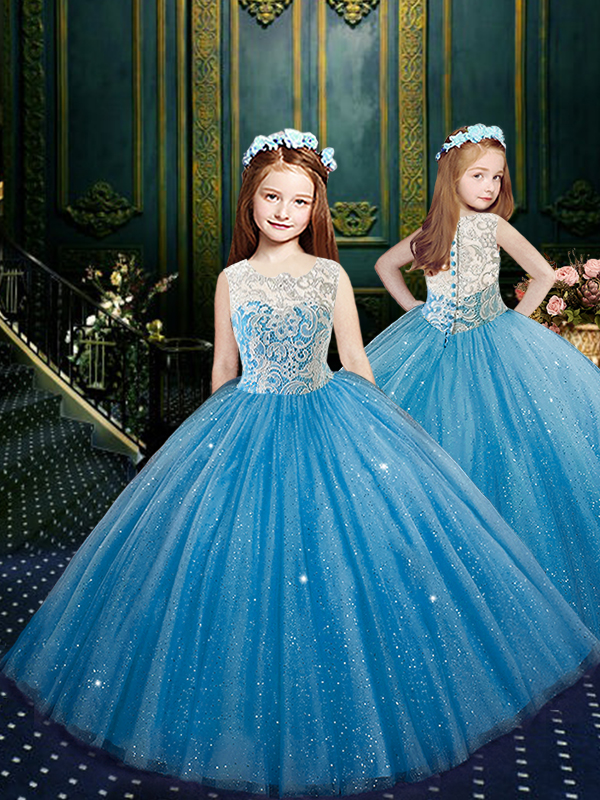 Home >  Special Occasion Dresses >  New Style Little Girl Pageant Dresses > Blue Tulle Clasp Handle Scoop Sleeveless Floor Length Little Girls Pageant Dress Wholesale Appliques