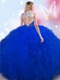 Blue Tulle Lace Up Ball Gown Prom Dress Sleeveless Floor Length Beading