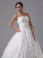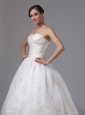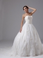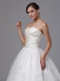 This angelic wedding dress features strapless with sweetheart neckline, it is accented with crosssed ruching bodice, which makes the dress unique and eye-catching. The delicate appliques on the wide waist band and the bottom part of the skirt adds to its glamour. This elegent dress has a chapel train and lace up closure.