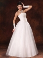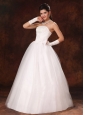 Walk in beauty along the aisle in this jewel-adorned bridal design dress. The strapless bodice made of shimmering beadings features a regular pleated bodice and the dropped waist is highlighted by a lovely bowknot. The flared, floor length skirt made of soft and flowy tulle is worked to produce eye catching impression. A lace-up back completes the look.