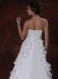 This perfect strapless chiffon wedding dress is featured with falbala embellishment on the bodice in the bust area and a bowknot around the edge of the bust line. The delicate foral adorned on the skirt adds more elegance and beauty to the dress. The Court train looks flowy and dynamic in any angle as rains of flowers fully scattered the bottom part in a circle. It is an ideal dress for your wedding!