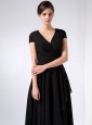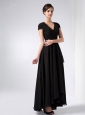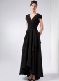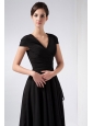 Chiffon is nice to wear, nice to look, and good to touch! This black chiffon features a cap sleeves deep V-neck bodice which flatters your feminine figure.The ruched beading waistband wraps your body to accent your sexy and glamour waistline. Floor length chiffon skirt contours tiers of sheer fabric and soft folds continue the beautifull silhouette. Hidden zipper up back finishes the perfect design.