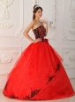 Do you want to be the focal point at the party? This red quinceanera will surely do you a favor. intricate embroidery with glittering beading, and symmetrical red lines encrusted on the corset bodice. The hand-made flower accented on the waist make the dress favorable.The skirt features appliqued trim which creates a beautiful shape of the dress.