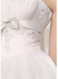 Smart and sophisticated, this wedding dress is a surefire hit! This strapless gown features delicate beadings on fitted bodice and a chic waistband on the empire waist flatter your bust. The puffy skirt has many layers of airy tulles which make you sway beautifully on the floor. The corset style bodice is finished with a hidden zipper up back. Do not hesitate? This is the best choice for your big day!
