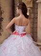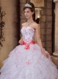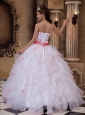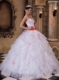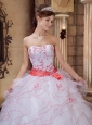 Look like you are floating on a cloud when you glide across the dance floor in this dreamy white quinceanera dress. The fitted ,strapless bodice is accented with the embellished appliques and beadwork throughout and the waistband contures your slim figure.Tiers of organza fabric with the contrasting color of the hem creates the skirt to a beautiful shape. A corset back completes this gorgeous design.You will be the unique one in any occasion.
