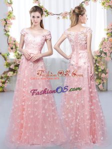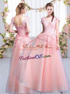 Cute Tulle Cap Sleeves Floor Length Bridesmaid Dresses and Appliques