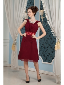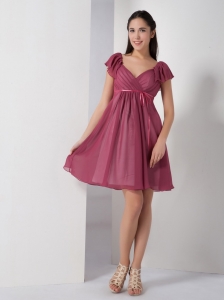 Customize Burgundy A-line V-neck Bridesmaid Dress Chiffon Ruch Knee-length