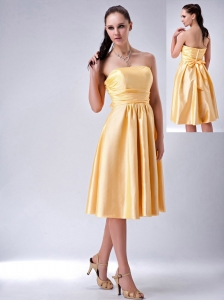 Special Gold Empire Strapless Bow Bridesmaid Dress Tea-length Satin