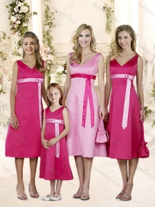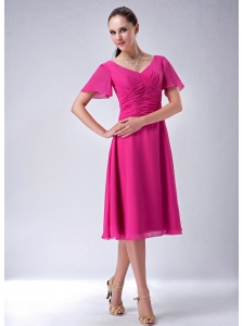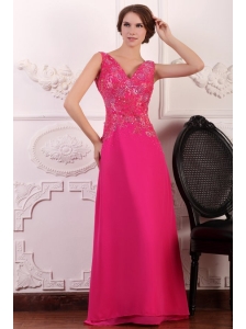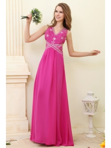 V-neck Empire Chiffon Appliques with Beading Prom Dress in Hot Pink