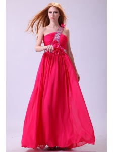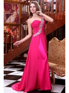 One Shoulder Chiffon Beading Sweep Train Prom Dress in Hot Pink