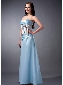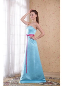 Light Blue Empire Strapless Brush Train Satin Sash Bridesmaid Dress