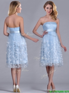 Gorgeous Empire Tea Length Applique Tulle Bridesmaid Dress in Light Blue