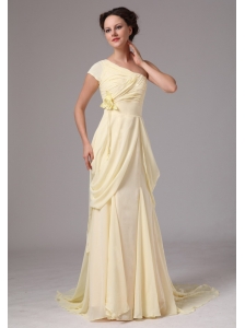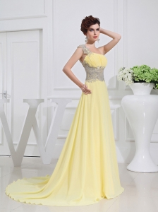 Empire Court Train Yellow Beading One Shoulder Prom Dress