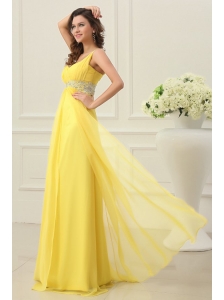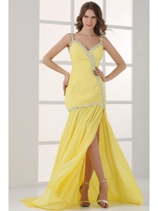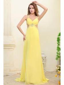 Yellow Straps Column Beaded Decorate and Silt Sweep Train Prom Dress