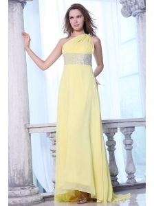 Empire One Shoulder Yellow Chiffon Beaded Decorate Waist Prom Dress