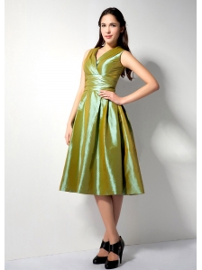 Customize Olive Green A-line V-neck Bridesmaid Dress Tea-length Ruch Taffeta
