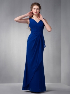 Royal Blue Column / Sheath V-neck Floor-length Chiffon Ruch Bridesmaid Dress