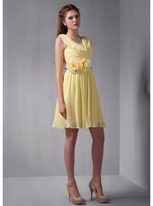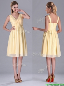 Empire Light Yellow V Neck Knee Length Short Bridesmaid Dress with Ruching