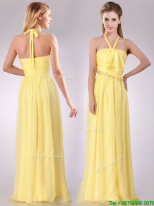 Lovely Halter Top Chiffon Ruched Long Bridesmaid Dress in Yellow