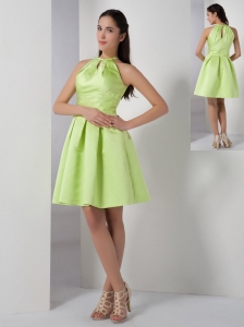 Yellow Green A-line High-neck Bridesmaid Dress Elastic Woven Satin Ruch Knee-length