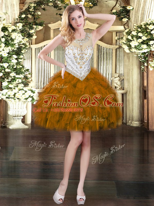 Brown Sleeveless Beading and Ruffles Floor Length Quince Ball Gowns