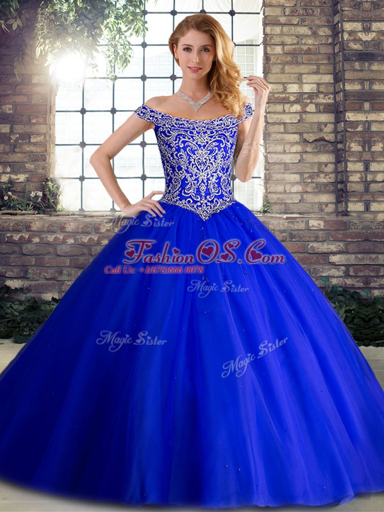 Brush Train Ball Gowns Quinceanera Dress Royal Blue Off The Shoulder Tulle Sleeveless Lace Up