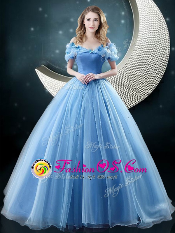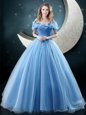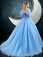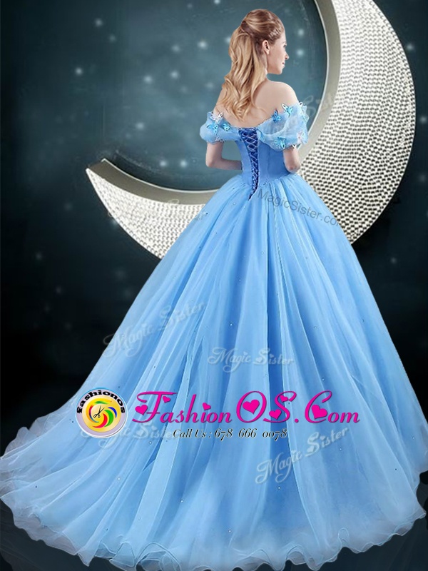 Brush Train Ball Gowns Quinceanera Gowns Baby Blue Off The Shoulder Organza Sleeveless With Train Lace Up