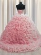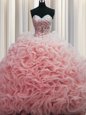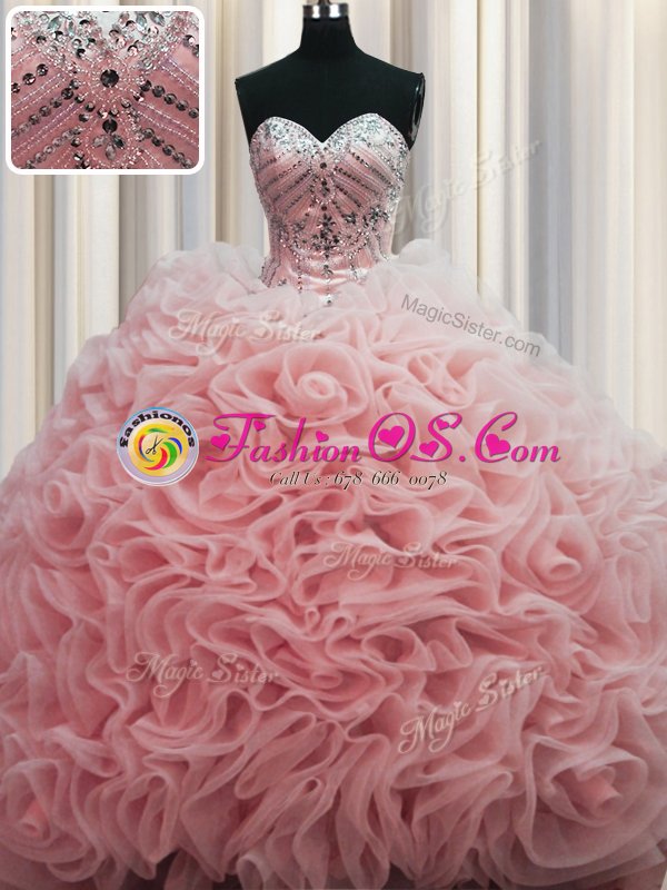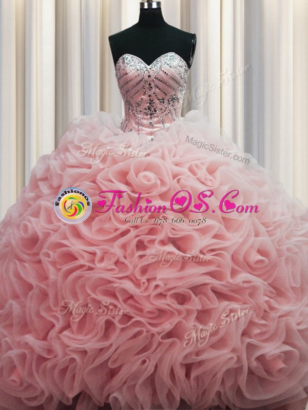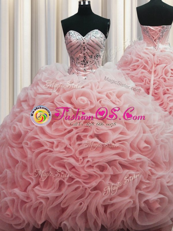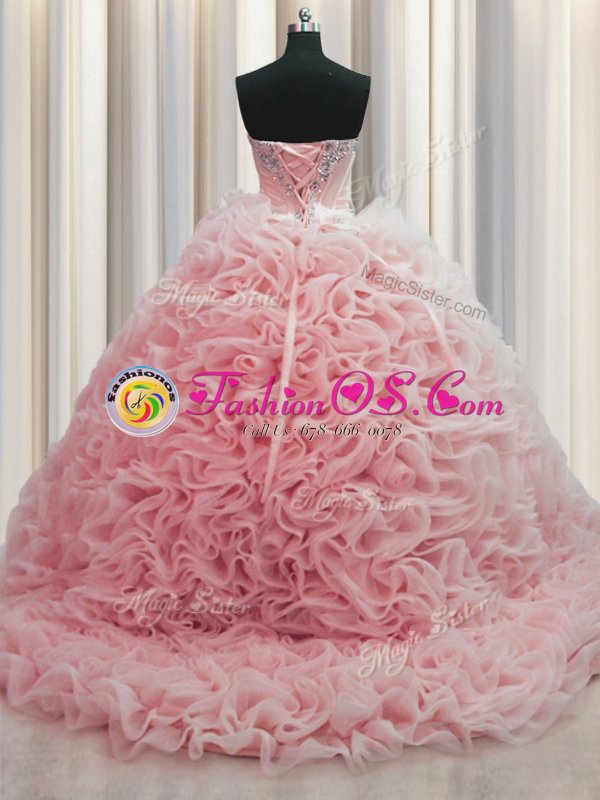 Brush Train Sleeveless Fabric With Rolling Flowers Floor Length Lace Up Quinceanera Gowns in Baby Pink for with Beading and Pick Ups