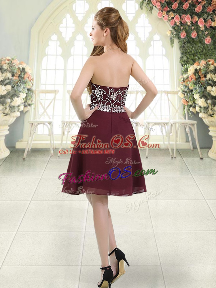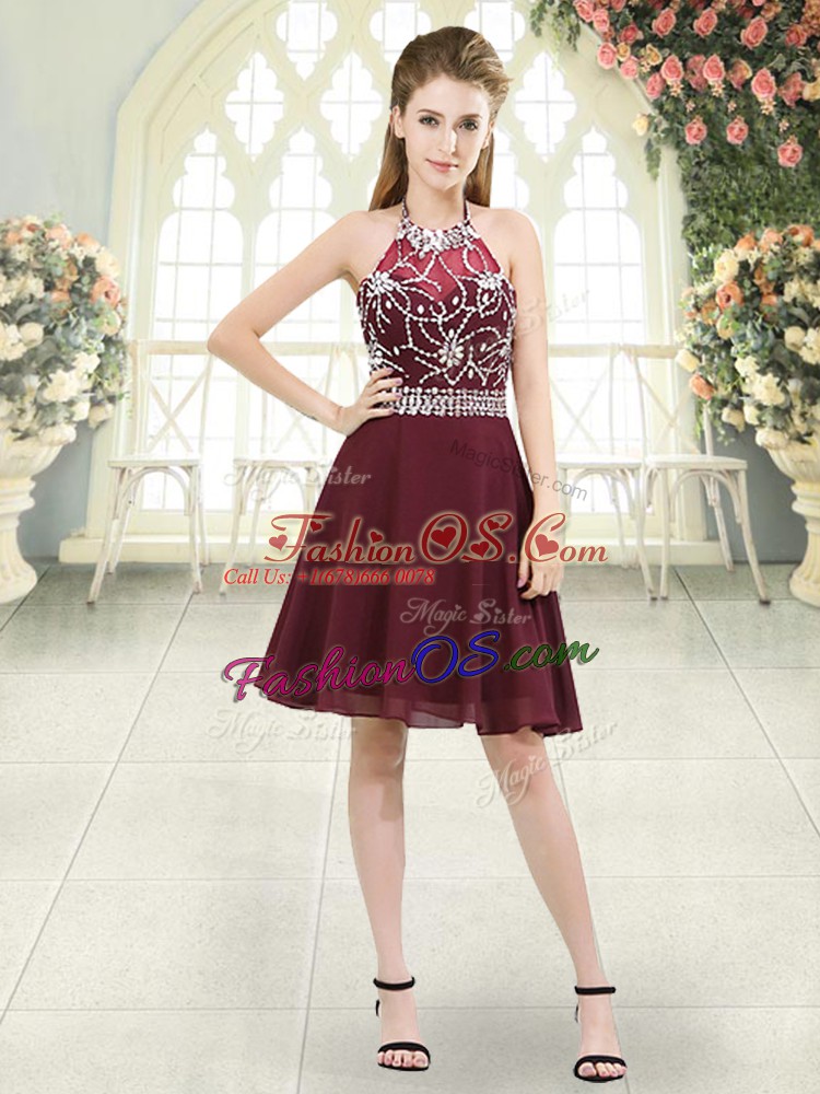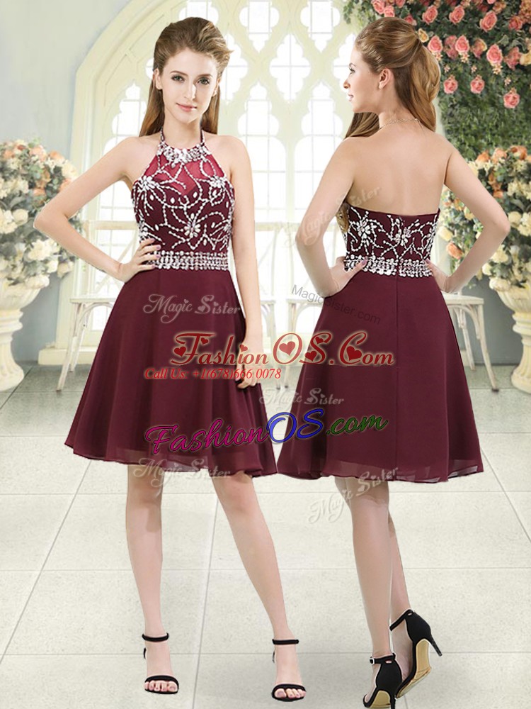 Burgundy A-line Chiffon Halter Top Sleeveless Beading Knee Length Zipper