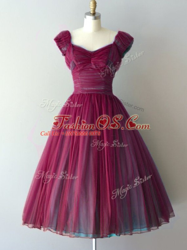 Burgundy A-line Ruching Quinceanera Court of Honor Dress Lace Up Chiffon Cap Sleeves Knee Length