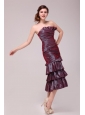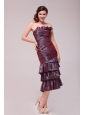 Burgundy Column Tea-length Prom Dress with Ruffled Layers