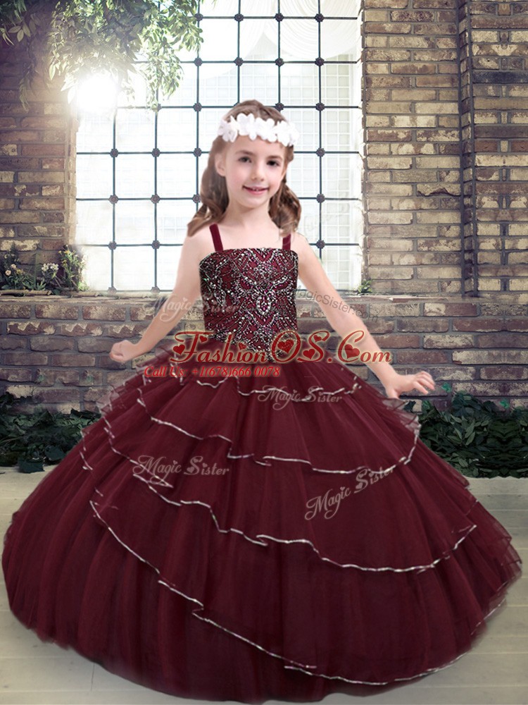 Burgundy Straps Neckline Beading and Ruffled Layers Girls Pageant Dresses Sleeveless Lace Up