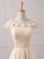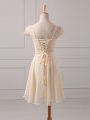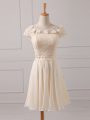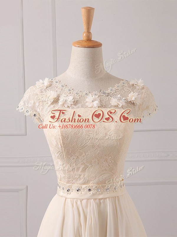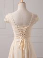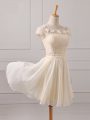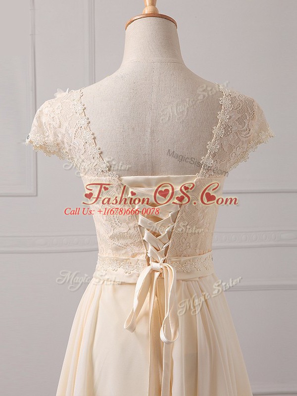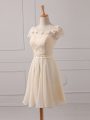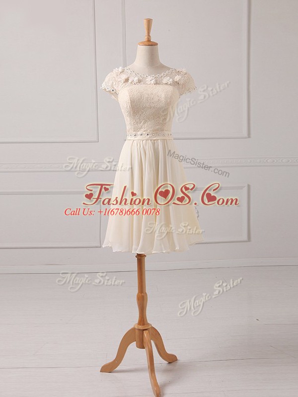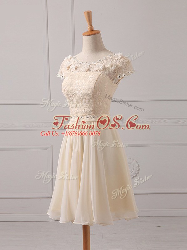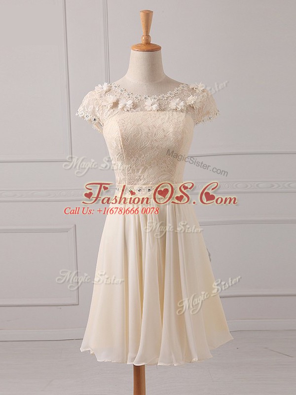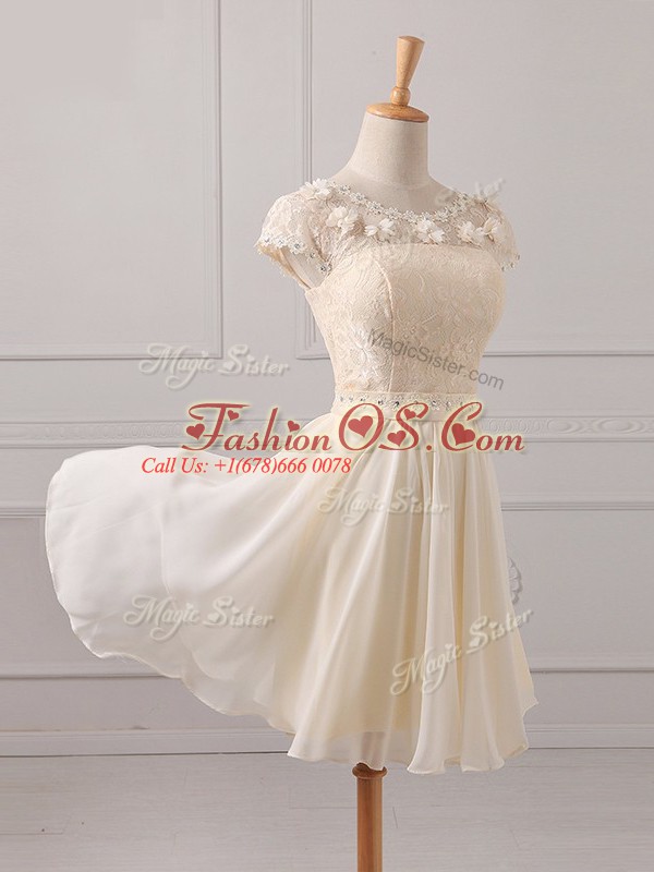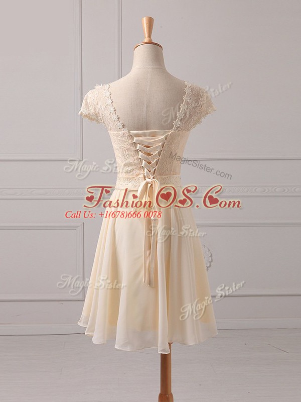Cap Sleeves Chiffon Mini Length Lace Up Wedding Guest Dresses in Champagne with Lace and Appliques