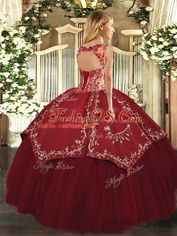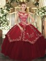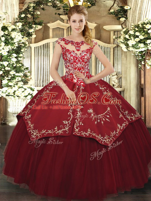 Cap Sleeves Floor Length Beading and Appliques and Embroidery Lace Up Quinceanera Dress with Wine Red