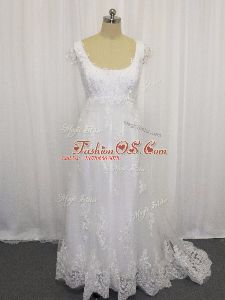 Cap Sleeves Sweep Train Lace Up Beading and Lace Wedding Dress