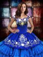 Captivating Off the Shoulder Floor Length Turquoise Quince Ball Gowns Organza Sleeveless Embroidery and Ruffled Layers