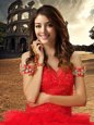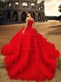 Home >  Quinceanera Dresses >  Unique Quinceanera Dresses > Captivating Off the Shoulder Sleeveless Tulle With Train Chapel Train Lace Up Sweet 16 Dress in Red with Beading and Ruffled Layers